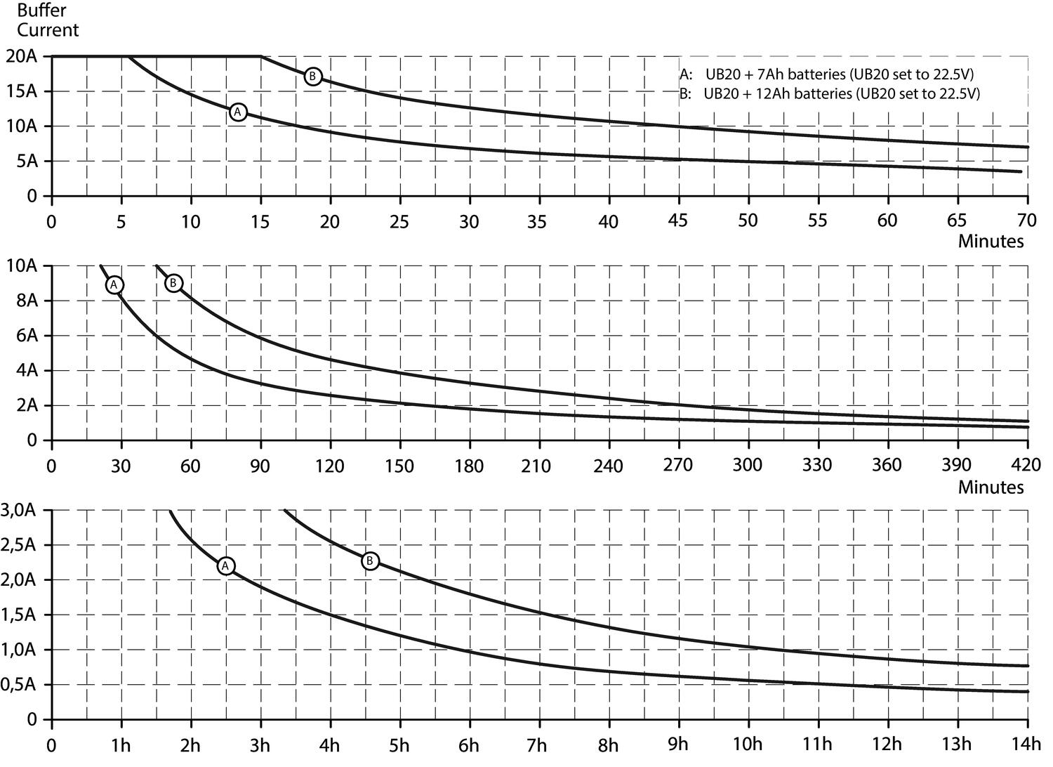 Buffer with 2x7 Ah battery ** | Min. 13.3 min at 10 A. Typ. 16.53 min at 10 A | |