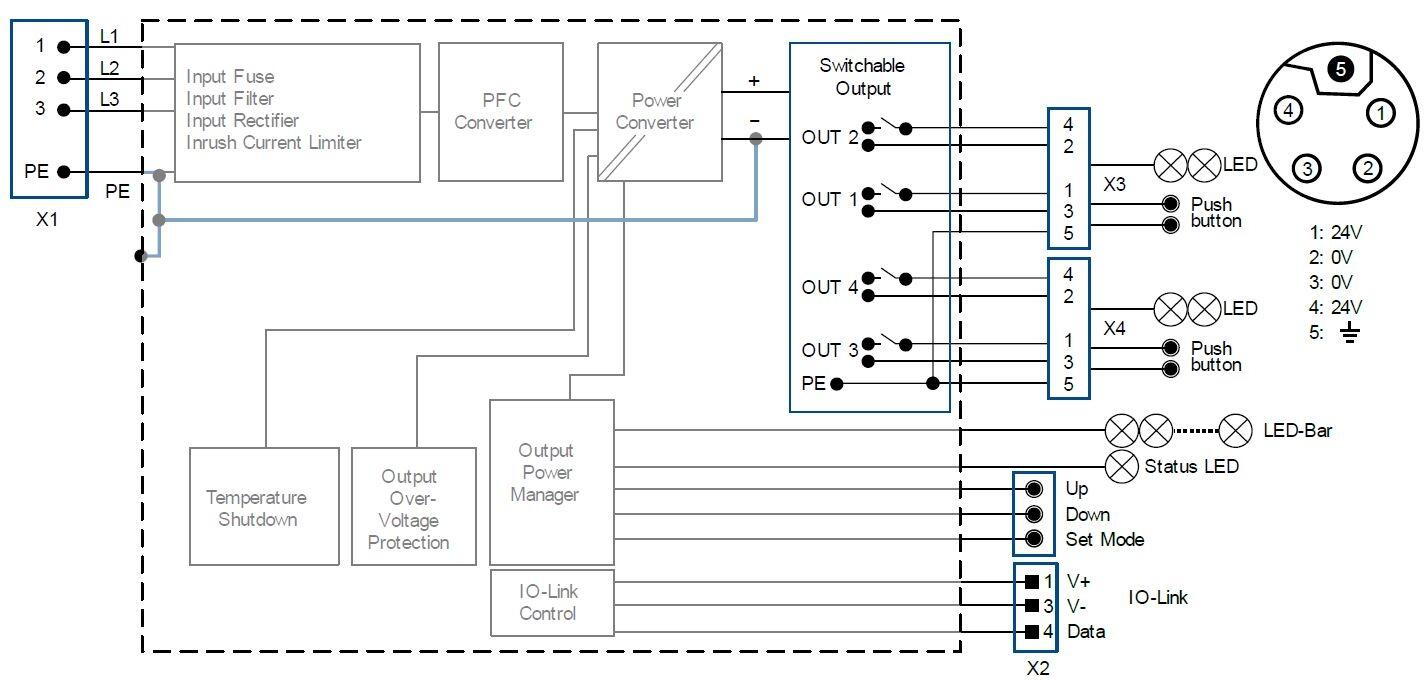 It provides two to four stabilized outputs that are galvanically separated from the input.